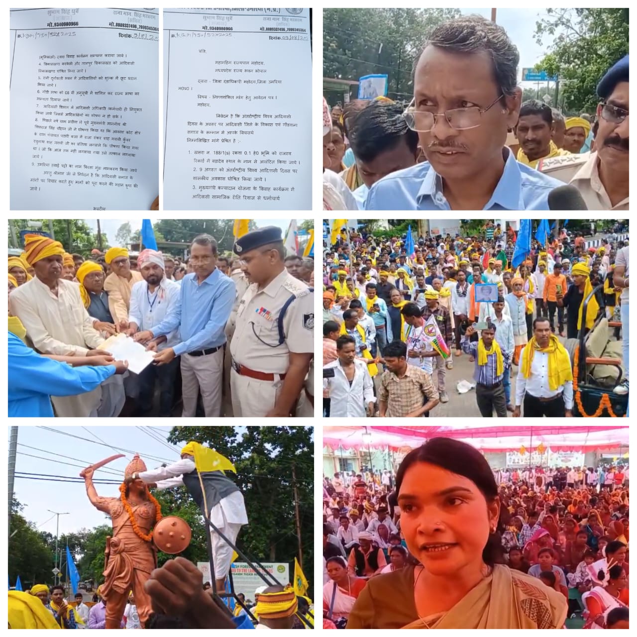 वहीं प्रदेश के महामहिम राज्यपाल के नाम 9 सूत्रीय ज्ञापन जिले के कलेक्टर के माध्यम से सौंपा गया जिसको लेने के लिए बांधवगढ़ तहसील के एसडीएम कमलेश नीरज आए और ज्ञापन लिया उन्होंने बताया कि आज विश्व आदिवासी दिवस के मौके पर आदिवासी संगठन ने 9 सूत्रीय मांगों का ज्ञापन सौंपा है हम इसके लिए प्रयास करेंगे कि ज्ञापन उचित जगह तक पहुंच जाए और जो हमारे स्तर की समस्याएं होंगी उनको हम हल करेंगे और बाकी प्रदेश सरकार के स्तर की वहां तक पहुंचाने का काम हम करेंगे।