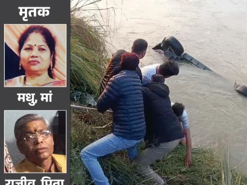 कार नहर में गिरी, कारोबारी, पत्नी और बेटे की मौत:औरेया में रात भर गाड़ी पड़ी रही, सुबह टायर दिखा, शादी फंक्शन से लौट रहे थे