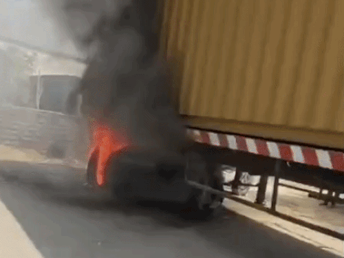 फरीदाबाद में कंटेनर के टायरों में लगी आग:11 हजार वोल्टेज की तार हुई टच; कैबिन से कूदकर ड्राइवर ने बचाई जान