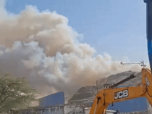 गुरुग्राम में बंधवाड़ी लैंडफिल साइट में लगी आग:ट्रैफिक रूट किया डायवर्ट, चारों तरफ फैला धुआं, फायर ब्रिगेड की 6 टीमें मौके पर