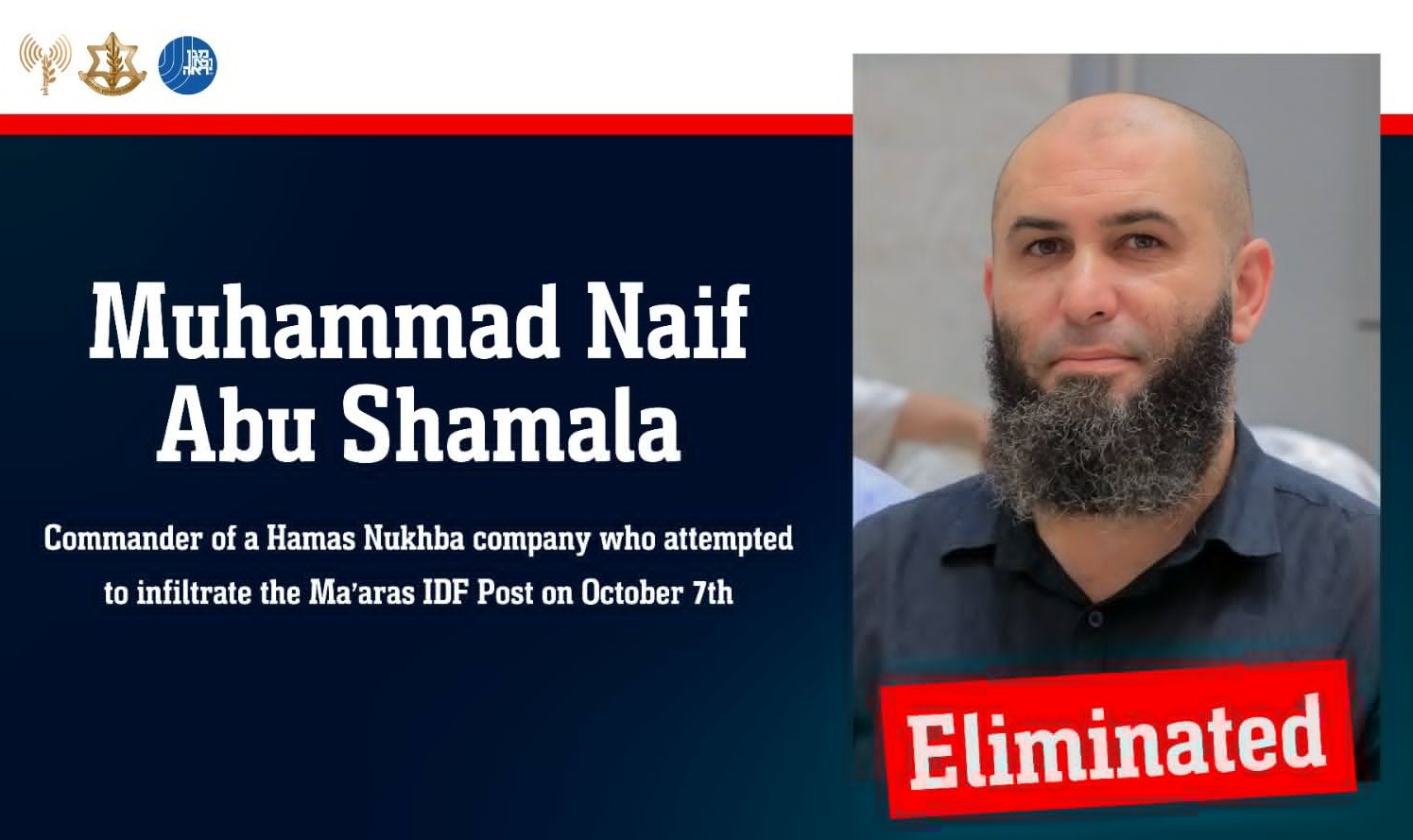 आईडीएफ ने ‘एक्स’ पर शमाला के फोटो के साथ एक पोस्ट में कहा कि हमास आतंकी मोहम्मद नाइफ अबू शमाला सात अक्टूबर, 2023 के नरसंहार के दौरान मारास पोस्ट से भाग गया था। गाजा पट्टी में युद्ध के दौरान शमाला ने आईडीएफ सैनिकों के खिलाफ कई हमले किए। एक अन्य पोस्ट में आईडीएफ ने कहा कि सुरक्षा बलों ने हमास आतंकवादी जिहाद कमाल सलीम नज्जर को ढेर कर दिया। नज्जर सात अक्टूबर के नरसंहार के दौरान इजराइली नागरिक यार्डेन बिबास के अपहरण में शामिल था। उसे 10 अगस्त को मार गिराया गया।