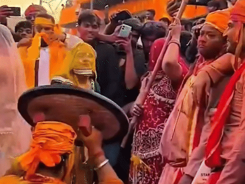 मथुरा में दुल्हन जैसी सजीं सखियों ने बरसाईं लाठियां:पुलिसवाले भी बच नहीं पाए; 20 क्विंटल गुलाल उड़ा; VIDEO में लट्ठमार होली देखिए