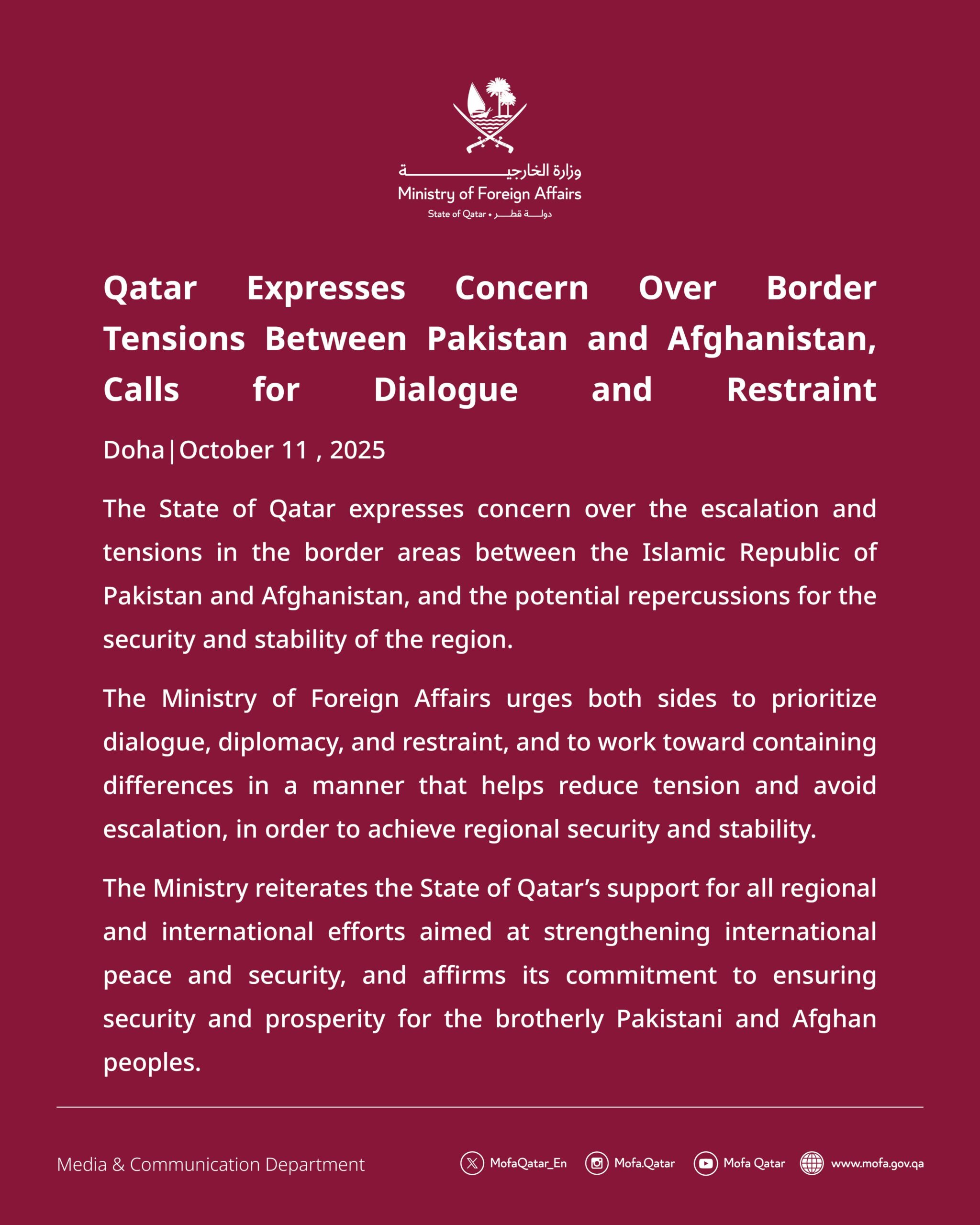 सऊदी अरब और कतर ने अफगानिस्तान और पाकिस्तान के बीच बढ़ते तनाव को लेकर चिंता जताई है।उन्होंने पाकिस्तान और अफगानिस्तान के सीमावर्ती क्षेत्रों में लगातार बढ़ रहे तनाव और झड़प की घटनाओं पर चिंता जताई है। साथ ही दोनों देशों से संयम बरतते हुए क्षेत्रीय स्थिरता बनाए रखने के लिए कूटनीतिक रास्ता निकालने पर जोर दिया है।