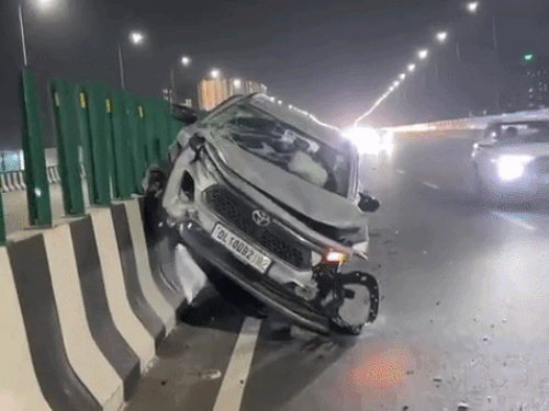 गुरुग्राम में डिवाइडर पर चढ़ी टोयोटा कार:एलिवेटेड द्वारका एक्सप्रेसवे पर हादसा; राहगीरों ने अंदर फंसे ड्राइवर को निकाला बाहर